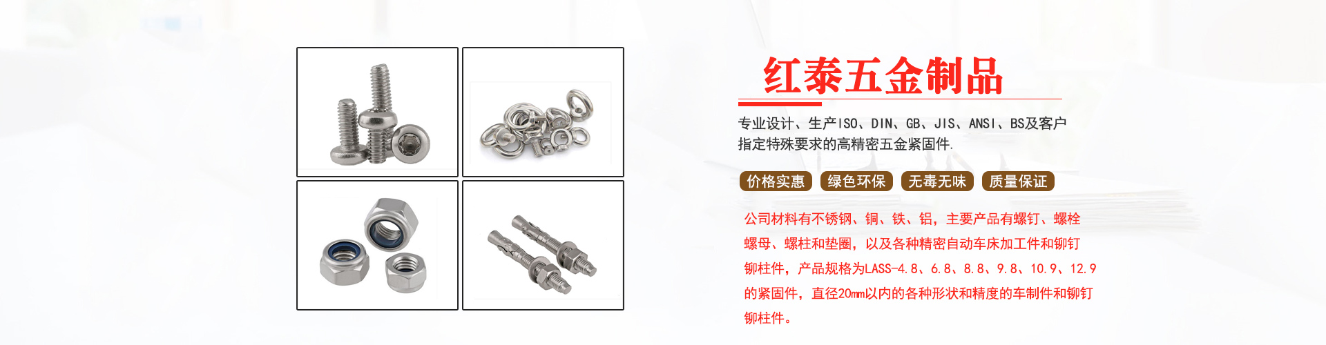 公司材料有不銹鋼、銅、鐵、鋁,主要產(chǎn)品有螺釘、螺栓、螺母、螺柱和墊圈,以及各種精密自動(dòng)車(chē)床加工件和鉚釘鉚柱件,產(chǎn)品規(guī)格為L(zhǎng)ASS-4.8、6.8、8.8、9.8、10.9、12.9的緊固件,直徑20mm以?xún)?nèi)的各種形狀和精度的車(chē)制件和鉚釘鉚柱件。